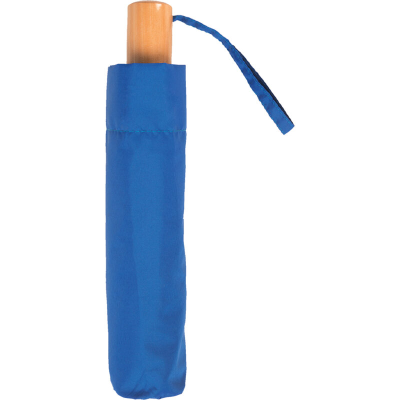 tessuto realizzato dal riciclo delle bottiglie in PET (RPET), richiudibile, con manico in legno e laccio per trasporto, asta in metallo, raggi in metallo e fibra di vetro, fodera in pongee RPET, apertura manuale.