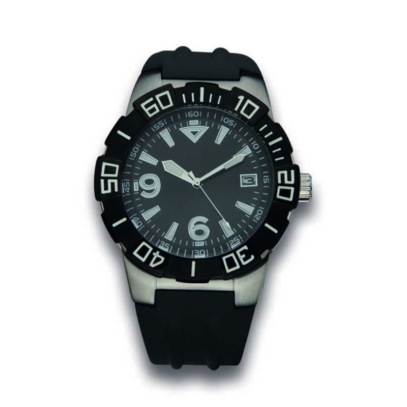 Analogico da uomo con indici a rilievo, lancette fluorescenti, ghiera girevole, datario, corona e fondello in acciaio a vite. Movimento: Miyota 2415/3ATM.