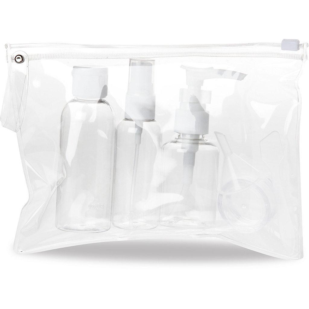 pratico set per trasportare liquidi che include un nebulizzatore in plastica da 50 ml, un dosatore in plastica da 50 ml, una bottiglietta in plastica da 80 ml, un imbuto, una paletta e un piccolo contenitore cilindrico. In astuccio in plastica.