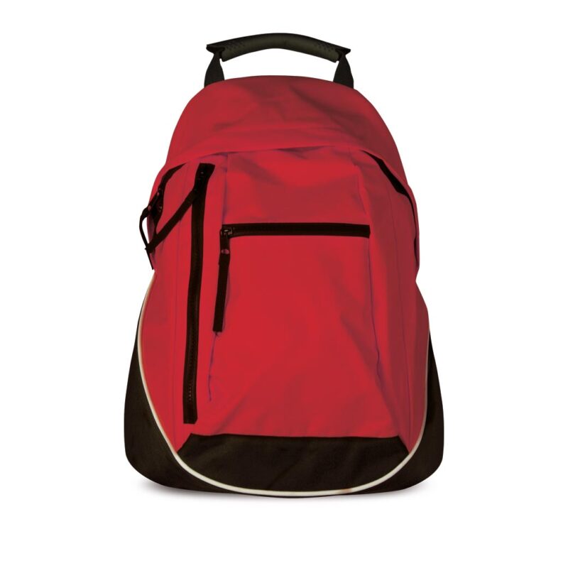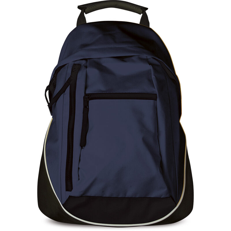 due tasche frontali, schienale e spallacci imbottiti, maniglia in plastica per trasporto.